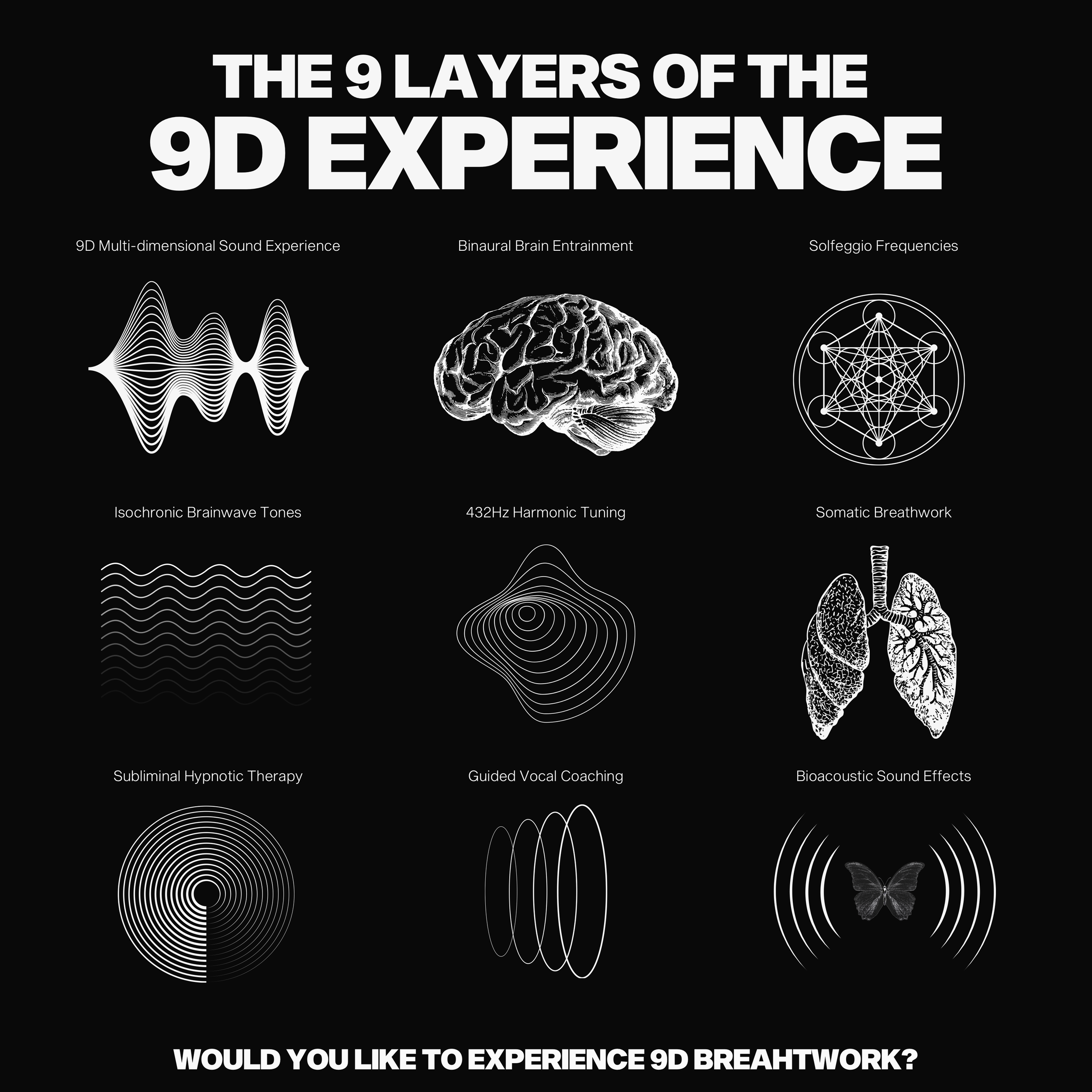 9D Breathwork is an immersive, multi-sensory breathwork experience that combines intentional breathing patterns with layered, cinematic sound delivered through headphones.