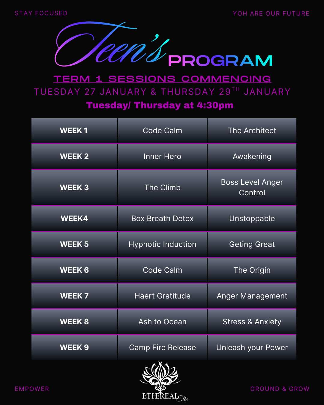 Each weekly session is based on a 9 week program specially designed to get the most out of your time at EtherealElle. Comprising two 9D breathwork Journeys EtherealElle’s Teem program has been specifically cultivated to be the ideal experience for ages 14 and up. Designed to calm the nervous system and ground the next generation, increasing focus, self awareness and reducing stress & anxiety that impacts the next generation more than ever before.